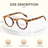 【Retro Trendy Style Design】-The round eyeglasses frames and double rivet decoration create you a super cute look,never outdated.The fine golden painting end of the frames temple make the glasses more special 【Blue Light Blocking Lens】-Blue light reading glasses can effectively resist 99% harmful blue light and glare,provide UV400 protection.Reduce eye fatigue,blurring vision,headache and other symptoms suffered from long-term staring at digital screens.Let you enjoy better sleep and digital time 【Accurate Magnification】-The magnification strength are accurate,which can ensure your clear vision and bringing the best reading experience.With multiple strength choice,you could choose the right one according to your need 【Lightweight Frame and Comfortable to Wear】-The light weight circle reading glasses has the characteristics of super toughness,impact and abrasion resistance.The unique design of the vintage round frame is suitable for all face shapes,bringing you a comfortable wearing experience.It is the best choice for glasses lovers 【Product Dimension】-Lens width:44mm(1.73inch),Lens height:41mm(1.61inch),Frame width:130mm(5.12inch),Nose Bridge:27mm(1.06inch),Temple length:145mm(5.71inch).Retro style reading glasses, please check size information carefully before ordering