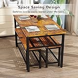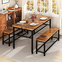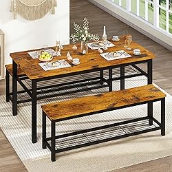Extra Storage Space:Designed metal rack under the table and benches that no other product does for added convenience and comfort to you and your family. You can display dishes and forks under the tabletop for easily access. And the bench enables to hold large items as you want. Fits a Family of 4:Two 38.5 inch bench-style seats with a small 43.3in by 28.7in table provide space for the whole family to enjoy. High-quality metal and MDF can easily support a party of four; each seat can hold up to 250 pounds, while the table boasts a high 200-pound capacity. Space Saving Benches Design:Both the 2 Benches can be conveniently tucked under the standard height table to space-saving storage while not in use, great solution for small spaces, small condo, small kitchen, studio apartment and more. This Dining Table also could be used as a computer desk or a study desk. Super Solid & Durable Structure: This 3 piece dining table set made of MDF and metal frames, with perfect edge technology, well made and solid, waterproof and anti-scratch, very easy to clean. The bars under the two benches enhance the durability and stability of the bench. Installation Without Obstacles& After-Sales Customer Service: Designed with easy and fast assembly in mind, have a manual with clear installation steps, all necessary tools included, so you can assemble it quickly. Table dimensions 43.3''L x28.7''W x28.7''H, Benches 38.5''Lx11.8''W x17.3''H. Any question please feel free to contact us and your problem will be resolved within 24 hrs.