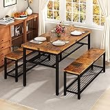AWQM 43.3" Dining Table Set for 4, Kitchen Dining Table with 2 Benches, Dining Room Table Set with Metal Frame & Storage Rack for Kitchen, Restaurant, Rustic Brown