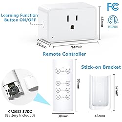 READY TO USE:Each G-Homa wireless remote control outlet kit comes with everything you need to get started (even the remote control batteries!). Simply plug in and you're good to go, or sync the outlet to suit your needs. STRONG SIGNAL:Our remote control light switch RF receiver and transmitter can penetrate doors and walls without interfering with other electronic devices. The signal can operate up to 100 feet in line of sight. SIMPLE AND CONVENIENT:Turn your electronic devices on and off with ease using either the remote control or the outlet itself; Suitable for almost all electronic devices including lamps, air conditioners, heaters, stereo systems, holiday light decorations, and suitable for a wide range of people, such as people with disabilities, the elderly, pregnant women, etc. FLEXIBILITY:With the option to pair multiple G-Homa remote control outlets together, you can expand your system and have all your household appliances easily accessible in the palm of your hand! SAFE AND RELIABLE:The outlet will stay in the off position after a power outage to save energy and protect your devices. Item NO: R2011W Model: RF102T Battery: CR2032 3VDC Rating: 125V,15A,1875W; Have ETL and FCC approved for safety and quality assurance; And provide lifetime customer service.