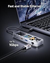 Dockcase Explorer Edition: Smart USB-C Hub 6-in-1, the perfect hub solution that combines functionality with style. With its sleek design, Dockcase stands out from the rest. Its commonly used interfaces meet your daily needs and the display and D-Key function control allows for customization of usage, giving you the power to take on even the most demanding tasks. Whether for work or play, Dockcase delivers a significant boost in performance, making it the perfect addition to your setup High-Speed + Safely: 2 USB A 3.0 & 1 USB C data ports support 5gbps high-speed transmission and 1 Gigabit Ethernet up to 1Gbp/s, while an HDMI port supports media display at resolutions up to 4K@60Hz, as well as high-velocity pass-through charging with 100W Power Delivery Smart Heat Dissipation: Built-in ch579m chip, smart display real chip temperature, the internal temperature is clear at a glance. The uni-body design with the aluminum alloy shell and fin pattern cover for easier heat dissipation to ensure stable work, product use temperature is much lower than peers D-Key Button: After the Smart Dock is powered on, the D-Key button can be used to operate the control panel, short press the D-Key to rotate the display direction of the dock screen, long press the D-key 6s to enter the dock's control panel, allows you to control various functions, switch operation modes intelligently to adapt to different working scenarios What you get: DockCase USB C smart visual hub, 1 USB-C to C full-featured data cable (0.98ft), user manual,12-month warranty, and friendly customer service