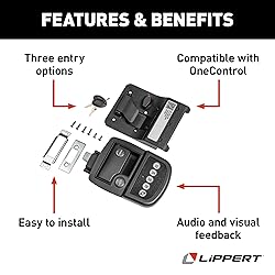 SAFE & SECURE — With the Lippert keyless RV door lock, you can keep your family and your belongings safe while you’re asleep at night or when your coach is unattended THREE ENTRY OPTIONS — Our Bluetooth RV lock comes with three convenient options for locking and unlocking your entry door using a key, the keypad or the OneControl app INTUITIVE FEEDBACK — This RV keyless entry door lock provides audible feedback when locking and unlocking functions are successful. The keypad also lights up in green, red or yellow to indicate proper code entry, errors or a low battery ONECONTROL-ENABLED — Through the OneControl app, you use different modes to make your battery life last while your unit is in storage or if the battery is running low EASY INSTALLATION — Our camper keyless entry door lock is an easy, DIY installation on most RV entry doors with standard latches