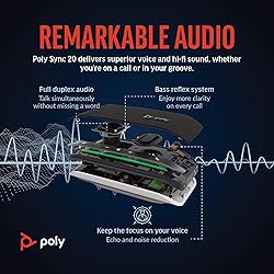 HEAR AND BE HEARD: Multi-microphone design with echo and noise reduction keeps the focus on your voice no matter where you are in the room; plus, full duplex audio enables natural, simultaneous conversations without missing a word. WORK ON THE GO: Keep your smartphone charged and ready using your Poly Sync 20 personal Bluetooth speakerphone, featuring up to 20 hours of battery life. It’s slim and portable, IP64 dust-and water-resistant, and comes with its own carrying case. EASY CONNECTIVITY: Connect wirelessly to your smartphone or tablet using Bluetooth or to a PC or Mac using the USB-C (or USB-A using included USB-C to USB-A adapter) cable for a corded connection. ALL IN ONE: This slim and portable speakerphone for conference calls is also a high-performance music speaker and smartphone charger. Enjoy superior clarity on every call thanks to the bass reflex system with dual passive sound amplification for natural voice and deep bass. STAY IN CONTROL: Programmable button lets you quickly access your favorite functions on your Bluetooth and USB speakerphone, including play/pause music, last number redial, voice assistant, and more, while highly visible light bar lets you view call status, even from across the room.