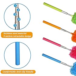 【PACKAGE】4 pack microfiber feather duster; 【Microfiber Head】The duster head is made of microfiber which is not easy to fall off. And the duster static adsorbs dust, no dust fall. 【Extendable Long Pole】Microfiber Duster can Extendable from 13 inch to 31 inch,the Head length:6 inch; The head can be bendable,and Easily clean those hard to reach spots. 【BendableHead】The bendable microfiber duster head is more convenient than ordinary dusters. It can be adjusted to any angle, that makes it easier to clean the dust hiding in high corner. 【Broad Application】Duster is suitable for cleaning the dust in the car,Computer, air conditioning, TV and other household appliances dust, cleaning the dust from the sofa, table, cabinet, etc.Can be inserted into any corner Let the dust nowhere to hide.