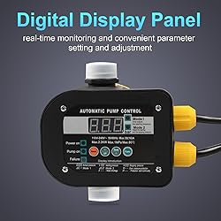 What is Automatic Water Pump Controller: It is a device or system used to automatically monitor and control the operation of a water pump. It utilizes electronic technology and intelligent control algorithms to monitor parameters such as water pressure, water level, flow rate, etc., and accordingly control the start, stop, operating time, and operating mode of the water pump Notable Features: It has a new pressure sensor technology, the digital screen shows the real-time pressure in the tube. The controller can be installed vertically or horizontally on the pump. Its advantages are wide starting pressure adjustment range, small differential pressure, low minimum lift requirements Multiple Functions: It is composed of two working modes to meet different application requirements by adjusting the buttons. Mode 1 only adjusts the starting pressure, Mode 2 adjusts the starting and stopping pressure. It has pressure protection and water pump frequently start prompt function. It can be forced to start the pump, in order to avoid the internal blockage of the pump, which is caused by a long time of unused. It can automatically start the pump in the case of water shortage Wide Range of Application: It can be widely applied to various types of water pump systems and water supply applications, such as water supply systems, agricultural irrigation, industrial applications, construction projects, swimming pools and wellness centers, water treatment systems, etc., to provide automated, efficient, and reliable control and management of water pumps Product Parameter: Rated Voltage: 110V Frequency: 50/60Hz Max. Current: 30(16)A Max. Power: 2.2KW Max. Pressure: 1MPa Starting Pressure: 0.5-6.7bar Stopping Pressure: 0.8-7.0bar Max Working Pressure: 8.0bar Min Differential Pressure: 0.3bar Max Differential Pressure: 6.5bar Max.working temperature: 60℃ International Protection Rating: IP 65 Screw: 2XG1" male Package includes: 1Pcs x Digital Display Automatic Pump Controller