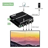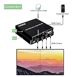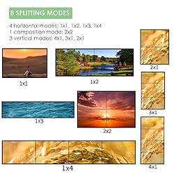 1 INPUT & 4 OUTPUT: 2x2 Video wall controller can assign an Interface or DVI device to 4 screens simultaneously, compatible with computers, laptops, set top boxes, DVD players, for , consoles, etc. Supports 180 degree image rotation and shielding function. 8 DISPLAY MODES: 2x2, 1x1, 1x2, 1x3, 1x4, 2x1, 3x1, 4x1, provide additional versatility in display options. Cascade modes 2x4, 2x8 with additional units. Has a separate 3.5mm stereo audio port that can be connected to the external speaker, sound bar, amplifier, etc. 1080P/60HZ HD RESOLUTION: video wall processor supports 4K at 25Hz, 30Hz, 1080p at 25Hz, 30Hz, 50Hz, 60Hz, 1080i at 50Hz, 60Hz (for live TV and other broadcast satellites) input video resolution, 1080p at 60Hz (in each display) output resolution. FOR RS232 AND IR REMOTE CONTROL: 2x2 Video processor is used to split a complete HD picture into 4 pieces with for RS232 and IR remote control, providing a more convenient control for home entertainment or professional center control. PLUG AND PLAY: Wall video controller supports Interface input and 4 HD Multimedia Interface outputs, supporting 1920 x 1080P 24, 30, 50, 60Hz and below input and 1920 x 1080P at 60Hz HD resolution output. Plug and play, no driver required.