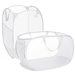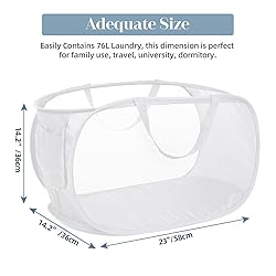 Upgrade Reinforced Design: Our pop up laundry basket use strong denser mesh and sturdy binding, both carry handles are reinforced joints, more durable and won't tear. Sturdy Construction: Made by thick and denser fabric material, supported by strong and collapsible steel frame, very lightweight and permits air to circulate, eliminating moisture and typical odors. Folding and Saving Space: The collapsible laundry hamper can be folded to flat or small circle easily when not in use. Storage and Tidy: Have large space and opening, can easily hold more clothes, goods, toys, etc. With extra side pocket can store laundry detergent or socks, towels, etc. Dimension: 22.8 x 14.2 x 14.2 inches. Versatile Use: The foldable hamper not only a good helper of daily laundry, but also can be used for home storage like clothes, sporting goods, toys, and so on. It's portable that make it perfect for dorm, campout, hotels and travel.
