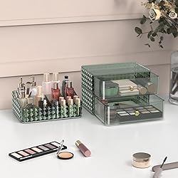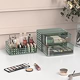 Rosoenvi Makeup Organizer for Vanity, Stackable Cosmetics Organizer and Storage, Cosmetic Display Cases with 2 Drawers and 1 Tray for Makeup Brush, Hair Accessories, Lipstick and Jewelry, Green