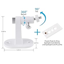 【DESIGNED FOR RING】ONLY compatible with Ring Spotlight Cam Battery & Ring Stick Up Cam and Ring Stick Up Cam Pro and Ring Spotlight Cam Plus/Pro (Battery), NOT fit any other Ring devices. (Note: Camera NOT Included.) 【PLACE WHERE YOU WANT】These versatile mount brackets allow you to secure your camera onto ceilings or walls, flexibly position your camera anywhere you want. 【PERFECT VIEW ANGLE】Easily adjustable and can swivel 360-degrees with a 90-degree tilt which allows you to adjust your cameras at your desired angle. 【EASY INSTALLATION】With our new plate, just attach your camera to this mount then fix it on the wall with included screws. 【INDOOR & OUTDOOR USE】This security wall mount is suitable for garden, living room, indoor and outdoor, etc. Just put it in a broad and high place like a corner or roof to get a wider vision.