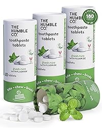 No Paste, No Waste Toothpaste Tablets: Keep your teeth and gums healthy with these convenient, travel-friendly toothpaste tabs. Includes three packs of 60 tablets with fluoride. Fresh mint flavor. Just Bite, Chew, Brush: Just bite one tablet and chew it into small pieces. Wet your toothbrush and brush gently for that clean, fresh feeling. Use twice daily. Do not swallow. Simple, effective, and tube-free. Developed by Dentists: Our cavity-fighting dental cleaning tablet formula is developed to reduce plaque, prevent tartar build up, and freshen breath. Contains xylitol and probiotics to balance the oral microbiome. Plastic-Free Packaging: Each pack comes in a plastic-free cardboard container designed to reduce waste and keep your brushing routine kinder. No Mystery Lists, Just Honest Care: Formulated with thoughtful ingredients including sorbitol and mint oil for all toothpaste dental tabs. Every Humble Co. product is 100% vegan, cruelty-free, PFAS and BPA - free, and made without unnecessary additives. Every Product Gives Back: Every purchase helps support SmileOnU, providing life-changing dental treatment to underserved individuals and communities in the U.S. and globally. Swedish Simplicity, Thoughtfully Designed: We’re The Humble Co., a Swedish brand making everyday care cleaner, kinder, and easier since 2013 with essentials like toothbrushes, toothpaste, and floss that simply work.