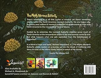 - The Mighty Monarch ButterflyThere's something in us all that pushes us onward, yet there's something mighty within the North American monarch butterfly. No one knows why, but every year millions of monarch butterflies travel thousands of miles over North America to the mountains of Central Mexico.Guided by its antennae, the monarch butterfly migrates across much of North America as the temperature begins to dip and summer comes to end. But what happens when one gets separated from the kaleidoscope of butterflies? In a blend of hope and belief, Michael Woodward, Jr.'s The Mighty Monarch Butterfly whisks readers on a journey up into the clouds of California and down its coast as she follows closely behind in search of her family.