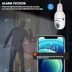 [Wireless & 2.4g&5ghz Wifi] :Compatible with E26 / E27 light socket makes it quite easy to installl this security camera, simply screw this camera into a light socket(110V~240V),NO DRILL, NO WIRING, NO POWER CABLE, NO HARD SETUP, then open the app to setup the camera within minutes, Work with both 2.4ghz&5ghz Wifi [1080P 2MP HD Video Resolution] : This IP surveillance camera is built-in 4pcs IR LEDs+4pcs white LEDs with 31ft w/b and 65.6ft FULL-COLOR night vision, providing you with a super clear viewing experience. All captured by this camera will be presented to you via fluent and stunning videos. With 355˚ pan, 110˚ tilt, 4x digital zoom, you can remotely control the pan-tilt-zoom feature via Tuya App anytime anywhere. [Motion Detection & Auto Tracking & Real-time Alerts]: this PTZ dome surveillance camera adopts a highly sensitive motion sensor. If some people invade your home, this security camera will track the motion and record every single move, together with a VOICE ALERT if needed. [Two-Way Audio & Sound Alarm] Built-in microphone and speaker, you can have a conversation between you and your visitor, you can also create a sound alarm to scare away the invader via the speaker. [Multiple View & Double Storage With Privacy Protection ] You could share your camera with friends and family to view simultaneously on phone. Save videos to SD card ( Not included ) or cloud storage (30 days trial ). With high level encryption, your videos can be only viewed by you even if this wifi camera was stolen or broken, no one can access your videos
