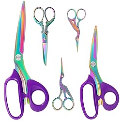 The blades of Fabric scissors and embroidery scissors are made of knife-grade stainless steel and surface with color titanium plating, showing better anti-corrosion feature and longer service life. Professionally-sharpened, fine grinding guarantees sharp edge even at its tip, and presents smoother and excellent cutting experience than ordinary sewing scissors. Fabric scissors 10.5-inch total length, 3mm thick blades, 150g weight, and 4.6-inch blade length achieve longer cutting length per time, save both time and strength. The Premium ergonomic ABS handle of scissors guarantees comfortable control of using and make it the best design for tailoring use. Package Information: 1x10.5" fabric scissors, 1x8" fabric scissors, 1x5.1" sewing scissors, 1x4.5" embroidery scissors, 1x3.6" embroidery scissors.