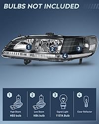 Compatibility:The headlight assemblies are compatible with 1998 1999 2000 2001 2002 Honda Accord. High beam /Low beam bulb type: HB3/HB4(Bulbs are not included) Turn signal light: 1157A(bulbs are not included), use Stock Bulbs for installation Super bright and wide illumination range: The integrated metalized reflectors of this headlight assembly increase light distance for better visibility & driving safety Durability: The high-impact housing withstands shock and vibration. With fully sealed silicon prevents environmental damages including freezing, foggy, fading, corrosion, and provides reliable service in sorts of weather conditions such as rain, snow, or dust storms, enabling your car looks better and drive safer DOT Compliance and safe Driving: To ensure driving safety for you and the oncoming driving circumstance, our 1998 1999 2000 2001 2002 Honda Accord headlights are DOT & SAE compliant. Our headlights provides clearer and further vision to see the wild animals, falling rocks or other obstacles at night. Reduce the possibility of danger. Package Includes: 1 Pair of Headlight for 1998 1999 2000 2001 2002 Honda Accord Headlamp (driver side and passenger side), 1x User Manual