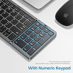 Bluetooth 5.1: Folding keyboard has built in Bluetooth 5.1 support for pairing up to three devices with the keyboard, so you can switch between them with a single click, even when using different operating systems. Foldable: The Type C charging port can be easily adapted to other devices' Type C data cable chargers, which can be folded into the palm of your hand and is lightweight, making it easier to carry around in your pocket. Numeric Keypad: The Bluetooth keyboard with numeric keypad is designed for customers who often need to enter numbers, making it easier and more efficient for you to work anywhere. Battery Powered: The portable Bluetooth keyboard is powered by a rechargeable lithium battery, which requires only two hours of charging and up to 90 days of standby time. If not used for 10 minutes, it will enter power saving hibernation mode and any key will wake it up. Operating System Support: Keyboard supports for OS X, for iOS, for Windows, for Android, etc. Maximum working distance is up to 10 meters.