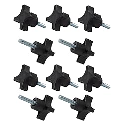 INCLUDES: Black 4-Arm Knobs with 1/4”-20 Threaded Studs (pack of 10) FUNCTION: Provides safe, secure hand-grip – allowing you to position, tighten or hold your equipment in place CONVENIENT: Perfect tool-less studded knob replacement fastener and an alternative to similar sized handles, or rounded knobs with projected studs APPLICATIONS: Ideal for heavy-duty clamping jobs, t-track assemblies, hand tools, feather boards, saw fences, drill press, woodworking jig making kits and fixtures PREMIUM DESIGN: Features a black, thermoplastic construction with ample finger grip spacing, a matte black finish and a molded-in threaded stud engineered out of zinc plated steel