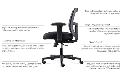 *With 3 locking positions, 22º back tilt, and a 2” seat depth, it is easy to accommodate different sit styles and body types. *Smooth height adjustment to accommodate varying heights to have secure feet on the floor. *It promotes straight posture and reduces strain by offering adjustable height, tilt, and backrest.