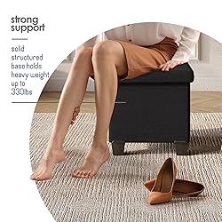 Black Ottoman Storage Cube: This storage ottoman with storage for living room decor transforms your space and reduces clutter, and can be used as a foot stools ottoman, storage chest or small ottoman foot rest. Max weight 330 lbs. Removable Legs: Our ottoman with storage for bedroom measures 15” L x 15” W x 15” H and folds flat when not in use. Adjust the height by adding or removing sturdy legs. Durable PVC Leather Ottoman: This square ottoman provides you with a comfortable seat for putting on socks and shoes, and makes a statement as a storage stool or footstool. Sturdy Lid: The cushioned lid of our storage ottoman cube is comfortable and supportive. One Removable Storage Bin: Keep small, loose items neatly organized with the easily accessible storage bin, and store bulkier items like throw blankets and pillows in the large ottoman space.