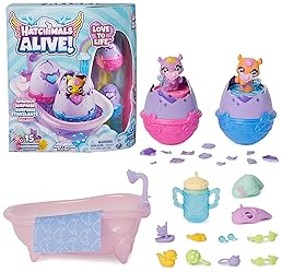 Love your Hatchimals to life: With your love and care, you can magically bring 2 Hatchimals Alive characters to life in a whole new way. The self-hatch surprise eggs hatch like real eggs Sparkly color reveal bathtime fun: Fill the tub, nurture, and bathe each Hatchimals egg one at a time. Remove the pacifier and swirl the egg to reveal a sparkly surprise – the water changes color and fills with sparkles as your friend starts hatching 2 color-change Hatchimals: Discover sweet hippo twins you can’t find anywhere else. After revealing your Hatchimals, each character changes color in cold and hot water 15 accessories: Add to your pretend play storytelling with a rubber ducky, soap, loofah, cucumber masks and towels the twins can wear, a fabric wash cloth & more adorable doll accessories Easter basket essentials & easter egg fillers: Add some fun to the Easter basket or as an alternative to candy, fill plastic eggs for the Easter eggs hunt with Hatchimals figures Includes: 2 Hatchimals, 1 Bathtub, 15 Accessories, 1 Instruction Sheet