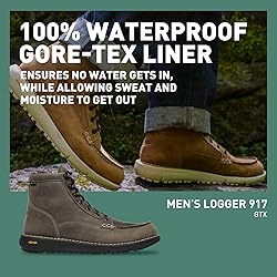 Built for Heritage: The Danner Logger Moc 917 men's work boots blend rugged craftsmanship with modern design, drawing from a rich legacy since 1936. Embrace adventure with boots that are expertly crafted for durability and timeless wear Weatherproof Comfort: Featuring a GORE-TEX liner, these winter boots for men ensure your feet stay dry and comfortable in any conditions. Experience reliable waterproof protection whether at work or on a hike Exceptional Traction: The Vibram Grip Outsole delivers superior traction and stability on any terrain, making these boots ideal for hiking or work. Depend on secure footing with a sole engineered for long-lasting wear Classic Leather Design: With a full-grain leather upper and moc toe, these boots combine classic style with practical functionality. Enjoy the enduring look and feel of leather boots men trust for both work and leisure Lightweight Performance: The Vibram SPE Midsole ensures these hiking boots men enjoy are both lightweight and supportive. Move with ease and confidence in boots designed for all-day comfort and rugged performance