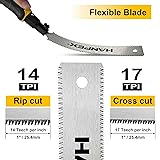 【Double Edged】Double-sided blade for making inside cuts from the left or right, 17TPI for cutting hardwood (Rip cut), 14TPI for cutting softwood (Cross cut) 【Flexible Blade】The blade is made of SK5 high-carbon steel, a flexible blade enables the flush cutting of plugs and dowels as well as precise cutting such as dovetails, small joints and cut-offs. 【Fine & Quick Cuts】Triple-ground and induction hardened teeth to sawing faster than traditional hand saws - cuts quickly and cleanly on the pull stroke. 【Non-slip Handle】The soft-grip handle gives comfort and support during use. 【Wide usage】The Hanpex hand saw is designed for precise cutting wood. Ideal for professionals & DIYer or site work