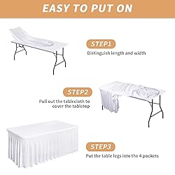 Set Includes: 1 x 6ft black stretch spandex tablecloth skirt that is perfect for a 6-foot rectangular table (72 L x 30 W x 30 H inches). Perfect Fit: The 2-in-1 design perfectly combines the tablecloth and table skirt. No overstretching. It can cover all items you prefer hidden under the table Which will bring a neat and elegant look during your events. Quality Fabric: Made of polyester and spandex blend. Our white tablecloth skirts are elegant, sturdy, soft, and stretchy. Wrinkle-resistant and sustained for multiple uses. Easy Setup: Fits standard 6ft foldable rectangular tables. No assembly or extra fasteners are needed. Just pull it over the table for a neat and elegant look. Versatile Use: Used for weddings, baby showers, bridal parties, birthdays, and Christmas celebrations. Enhances decor for banquets, dessert tables, and cocktail parties.