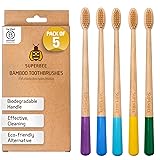 SUSTAINABLE ORAL CARE – Each bamboo toothbrush is crafted from renewable bamboo with soft bristles. Vegan, cruelty-free, and shipped in recyclable packaging for eco-conscious oral hygiene. SOFT BRISTLES – This non-plastic toothbrush features gentle bristles that clean teeth effectively without irritating gums. A sustainable upgrade for your daily oral care and planet-friendly habits. PERFECT FOR FAMILIES – This pack of 5 soft wooden toothbrushes features ergonomic colorful handles. A sustainable choice for households or a year’s supply of eco-minded oral care for one. COLORFUL DESIGNS – Each organic toothbrush in this 5-pack features a bright, cheerful color so every family member, adult or child, can easily identify their brush and avoid mix-ups. PERFECT FOR TRAVEL – A plastic-free toothbrush ideal for carry-ons or toiletry kits. Pair with SuperBee toothpaste tablets or organic floss for a low-waste oral care routine anywhere you go.