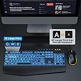 【Large Print High-Contrast Keys】 Bold, oversized fonts with high color contrast—no more squinting or fumbling for keys. Perfect for seniors, visually impaired users, students, and office workers who want clear, instant key recognition for smoother typing. 【Ergonomic Wrist Relief】 Soft palm rest + stable bottom support + scientific key layout. Reduces wrist strain and soreness from long hours of typing, making it comfortable for all-day work, study, or gaming. 【Non-Slip Comfort Mouse】 Contoured grip fits your hand naturally—cuts hand fatigue even with extended use. Anti-slip base prevents sliding; single-color backlight lets you find it fast in dim rooms. 【Backlit Function】Keyboard features 7 vibrant colors and 4 adjustable modes with customizable brightness for easy low-light typing. Backlit can choose to turn on/off and adjust brightness. 【Practical Multi-Scene Gift Choice】 Large print reduces eye fatigue; ergonomic design eases wrist/hand strain—ideal for students, seniors, office workers and daily typists. Great for holidays, birthdays or thoughtful daily care 【Plug & Play, No Charging Hassle】 5.2ft USB cable for instant connection—no drivers or charging needed. Compatible with Windows, PCs, laptops, Vista, macOS, and Chrome. Note: Multimedia keys may have limited functionality on macOS; not directly compatible with Apple devices. 【Quick Note】 This keyboard doesn’t have backlight memory. After restarting, simply reselect your preferred mode—easy to operate in 1 second.