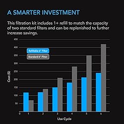 Reusable carbon filter features a patented design that eliminates the need to replace entire filters. Includes 1+ refill to match the filtration capacity of two standard 6” carbon filters while costing less. Removable twist-off flanges support easy, tool-free refilling using the included funnel and scoop. Larger chamber is lab-tested to block odors as effectively as standard filters with no compression required. Dual-layered steel mesh with protective coating withstands high humidity in grow tents through many grow cycles.