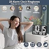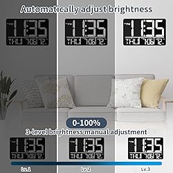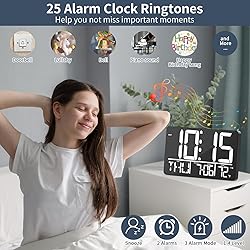 Large Display: Our digital wall clock features an impressive 13" oversized LED display, allowing you to effortlessly read the time, date, day of the week, and room temperature from various angles even from a distance. It is the perfect choice for seniors and those with poor eyesight. Easy Setup and Wireless Remote: This large screen digital clock is very easy to set up, it comes with a wireless remote control, even if the wall clock is on the wall, you can easily complete or update the clock settings within 10 meters, which is very convenient for people with limited mobility. 25 Unique Ringtones and 2 Alarms: Our bedroom clock offers 25 different ringtones, catering to your preferences for various music styles, rhythms, or sounds, ensuring you wake up in the morning in a way you love. You can also set two separate alarms to remind you of different appointments or tasks, ensuring you never miss any important events. 3-Level Brightness and Auto Dimming: Our clock features a 3-level adjustable brightness display, allowing you to choose the brightness level according to your preference and needs. Additionally, it incorporates a built-in light sensor that automatically adjusts the brightness of the wall clock based on the surrounding light conditions. Whether it's day or night, the clock will maintain an optimal brightness level, avoiding harsh glare or dimness that may affect time observation Auto DST function: This kitchen wall clock automatically adapts to daylight saving time, so you don't have to worry about forgetting or changing the time by mistake, saving you time and energy. Countdown Timer: This classroom wall clock comes with a timer function that does not require an additional timer to time it, it has a maximum timer time of 29 hours, 59 minutes and 59 seconds and is great for time management, fitness, exam revision and competition timing! You Will Receive: digital wall clock, power adapter + 1.5 meter power cord, wireless remote control, product manual and friendly customer service. (If you have any dissatisfaction or questions about our digital clocks, please email us and we will reply as soon as possible within working days).