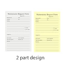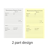 - Package Include: Maintenance Request Form X 6 50 Sets Each Book, Total 300 Sets. Product Specification: Material:These maintenance request forms are made of premium paper Size: 5.5”WX8.5”L(14X21.8cm) Feature: ☁Designed with a non-carbon copy paper to provide two copies of the same check for accurate accounting. ☁A wraparound board: In order to prevent ruining the other copies when writing a form, each Maintenance Request book has an attached cardboard, which is in the book and not get lost. ☁ Sturdy paper that tears off easily along the perforation, but does not fall out, as well as flawless transfers to the yellow duplicate paper. Wide Application: The maintenance work order forms perfect for real estate management, hotels, office buildings, schools, Organizations, Hospitals, etc.