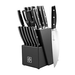 15PC CHEF'S KNIFE SET: Contains 13" Chef Knife, 13" Carving Knife, 13" Bread Knife, 12" Santoku Knife, 9.5" Utility Knife, 8" Paring Knife, 6pc Serrated Steak Knives, Honing/Sharpening Steel, Precision Kitchen Scissors all in a Premium Knife Block MASTERCHEF APPROVED, FROM STUDIO TO KITCHEN: Approved by the MasterChef team and donned by its season 12 & 13 contestants, this 15-piece professional collection was designed with precision, style and performance in mind. Constructed with X50Cr15MoV stainless steel, these high-carbon knives are fitted with triple riveted handles, hand sharpened corrosion resistant blades, and a stainless-steel bolster to provide optimal handle to blade balance to accommodate all of your preparatory needs. CORROSION RESISTANT STAINLESS STEEL: Each blade in this knife collection is crafted with high carbon X50Cr15MoV steel for enhanced corrosion and abrasion resistance, hand-sharpened to a razor sharp finish, and fitted with a bolstered and triple riveted handle for optimal blade to handle balance. THE ULTIMATE PROTECTIVE BLOCK: The matt-coated and sustainably sourced rubberwood block is quintessentially MasterChef in its sleek design and functionality, with each knife slot containing a protective inlay to ensures even balance and wobble-free placement. Each knife slot is fitted to the base of the interior block, ensuring full-blade quality conservation and dullness reduction, reinforced by the stabilising brushed steel plating surrounding the slots. A GIFT LIKE NO OTHER: Featured across your TV screens all summer, the signature MasterChef logo is engraved on the bottom of the handles, the blades and the block itself. These deep-carved accents are the perfect embellishments for long-time fans of the show that have been seeking their first Chef adjacent knife set.