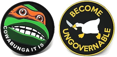 Get this great bundle - 1 each of 2 different patches - Cowabunga It Is and Become Ungovernable Goose with Knife. Each patch is backed with hook fabric for attaching to all of your tactical gear.