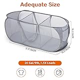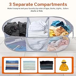 - This strong mesh pop up laundry hamper has 2 compartments design, which can used as a laundry sorter, and help you to sort your laundry by color or type. The laundry basket is made with sturdy fabric and 1.5x loads net. Makes carrying laundry easier, easy to open and put away. Easy to carry up and down stairs with multiple handles and lightweight design. The collapsible basket has durable well-built, making it last a long time use. The portable hamper is well-made, can hold a lot of laundry or any other household items. The laundry hamper can be easily fold to small circle that hold in place by belt.