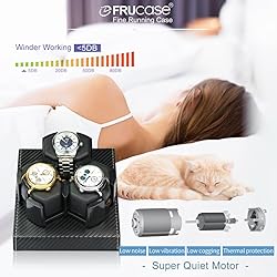 【High-quality Material】Black PU leather. It's moisture resistant, and with nice touching feeling. Intelligent integrated circuit is used in the equipment to reduce the internal wiring, so the circuit performance is more stable and the heat dissipation performance is good.Powered by USB cable.The watch pillow is made of high elasticity memory cotton, which can be well fixed for both men and women's watches. 【Super Silent Motor】The motor is very stable and without noise. The noise level can be completely ignored, even at night in the bedroom will not affect sleeping. Frucase watch winder has been fully tested and will not cause damage to your expensive automatic watches due to magnetization.(*TIPS:Watch winders are not compatible with Seiko Kinetic Watches because the watch mechanism is not the same as traditional automatic movement watches.) 【 2 Rotation Modes】This device is powered by USB cable and has 2 modes to choose from. ①Mode 1 : Clockwise for 2 minutes, stop for 6 minutes, then counterclockwise for 2 minutes, stop for 6 minutes and cycle.②Mode 2 : Clockwise for 2 minutes, stop for 18 minutes, then counterclockwise for 2 minutes, stop for 18 minutes and cycle.It is recommended to choose 1 mode for short-term use and 2 mode for long-term storage. 【USB Cable Driver】It uses USB cable for power supply and can be applied to any USB socket (Note: ① USB cable is included. ② USB wall plug is not included. ③ battery cannot be used). 【After-Sales Service】Equipment Size is 6.1 X 5.1 X 6.9 inch. Weight is about 800g. Circumference of watch pillow:6.5~8.6 inches. Small and exquisite, easy to carry it. 1 Years Warranty - Customer service is very important and we stand behind our products. Any problems you have please contact us.