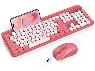 【Colorful Retro Typewriter Keyboard】The retro round keycaps not only add a unique and stylish look but also provide a comfortable and satisfying typing experience. This charming setup is the perfect match for Windows users seeking a blend of style and performance. 【Specific Devices Holder 】This colorful keyboard is equipped with an additional space to place your phone, tablet, or other gadgets, allowing you to easily deposit your device while working or browsing. *Please Note: The keyboard is not compatible with macOS, iOS, iPhone, or iPad. 【2.4 GHz Stable Wireless Connection】Enjoy the freedom of wireless connectivity up to 33 ft without the hassle of cords anymore. One USB receiver can connect both the keyboard and mouse (Stored in the mouse's battery compartment). No Delay, No Dropout. Not support Bluetooth. 【Multifunctional Silent Mouse】The wireless mouse is designed to be ultra silent, providing a quiet and peaceful working environment. With 3 speed levels (800/1200/1600) for precise and smooth navigation on a wide range of surfaces. It also features forward and backward shortcut keys, making it portable for page navigation and file browsing. 【Comfortable Design & Removable Keycaps】The foldable feets ensure a comfortable typing position and reduce stress on your wrists. In addition, the contour of this computer mouse fits your hand comfortably, minimizing fatigue during long-term use. The removable keycaps facilitate cleaning. 【Auto Sleep Mode, Long Battery Life】Both the wireless keyboard and mouse combo feature independent power switches and an auto sleep mode that activates after 30 Mins of inactivity. Wake them up with a simple double-click on any key. The keyboard requires 1 AAA battery while the mouse requires 1 AA battery (not included). 【School Essentials & Desk Accessories for Windows】The cute keyboard and mouse combo allows you to use your Windows laptop or desktop comfortably while having the freedom of wireless. It is a must-have for back-to-school, and also a practical office accessory and desk decoration. Not compatible with macOS, MacBook, iMac, iPad, iPhone, Chrome OS, or Bluetooth devices.