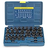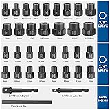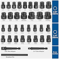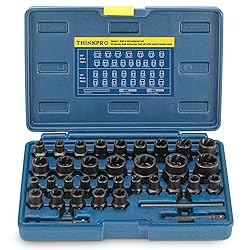 - Thinkpro 35PCS Impact bolt removal tool- your ultimate solution for tackling stubborn, stripped, or damaged bolts, nuts, and screws with ease. Engineered to perfection, this bolt and nut remover set is designed to meet the diverse needs of both professionals and DIY enthusiasts. Efficiency Redefined:Our bolt extractor kit is meticulously crafted to ensure efficient removal of rusted, worn, or painted-over fasteners. With a comprehensive selection of standard (SAE) and metric (mm) sizes, you can confidently tackle any project knowing you have the right tool for the job. Designed for Tight Spaces:Say goodbye to frustration caused by restricted access! The Thinkpro bolt extractor socket set features a longer and slimmer profile, allowing you to reach bolts in tight spaces effortlessly. Gone are the days of struggling with traditional hex extractors - our innovative design compensates for space limitations, ensuring hassle-free extraction every time. Unmatched Gripping Power:Equipped with reverse spiral flutes, our nut and bolt extractor sockets deliver superior gripping power. The internal thread of each socket firmly grips the bolt, providing exceptional torque. As you turn, the screw extractor set tightens its grip, making stubborn fasteners a thing of the past. Convenience at Your Fingertips:We understand the importance of versatility in your toolkit. That's why our bolt extractor set includes standard 1/4" and 3/8" square head and hex adapters, enabling you to use your preferred hand, air, or power tool. Additionally, a knock-out pin is included for effortless socket removal, enhancing your overall user experience. Built to Last:Crafted from high-hardness CR-MO steel, each component of our bolt extractor set is engineered for durability and longevity. Packaged in a heavy-duty case with laser-etched dimensions, organizing and identifying your sockets has never been easier. Rest assured, Thinkpro delivers trustworthy quality you can rely on. Experience the difference with the Thinkpro 35PCS Impact Bolt & Nut Remover Set - your go-to solution for removing stubborn, rusted, or damaged fasteners with precision and ease. Upgrade your toolkit today and tackle any project with confidence!