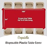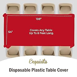 - Exquisite Premium Plastic tablecloths With the Exquisite Plastic table covers you"ll have everything you need to complete your event! Made of heavy plastic material, our collection of table covers are certain to meet all of your party needs. Available in a wide variety of colors, sizes, and Styles, our table covers are the perfect addition to any event - from birthday parties to anniversaries, weddings to banquets. What's In The Set: - 24 Premium Plastic Tablecloths Sizes: - 54 in. x 108 in. - 84 in. Round Colors: Aqua Blue Black Burgundy Cerise Dark Blue Dark Green Navy Blue Gold Turquoise Emerald Green Ivory Lavender Light Blue Plum Light Mint Orange Peach Pink Purple Red Silver Teal White Yellow Light Yellow Brown Sky Blue Lime Green Product Features: - Classic look. - Great for all occasions. - High quality plastic. - Disposable or reusable. - Extra high opacity - allows for minimal transparency We guarantee you'll have a wonderful event. If for whatever reason you are not satisfied with your disposable plastic dessert combo set contact us and we will resolve any issues you may have. Party on!