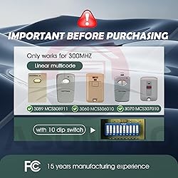 **Compatible List**: Works for 300MHZ 10 Dip Switch Multi-Code Gate Opener MultiCode Garage Door Opener 3089 MCS308911,3060 MCS306010,3070 MCS307010. 【After-sale Service】We provide 10 YEAR warranty. If you have any query, please contact us through our store homepage "Ask a question" or support email and we will get back to you as soon as possible within 24 hours. **Unmatched Durability & Reliability**: This remote has passed 100,000 validation tests and is FCC certified. Its robust ABS alloy casing ensures it can withstand drops, providing long-lasting performance you can trust. **Extended Battery Life**: Equipped with a 9V Hight Capacity battery and a third-generation intelligent low-power chip, this remote offers prolonged battery life and compatibility with various garage door motors. **Top-Tier Security Features**: Featuring 300MHZ Fixed Code technology, this remote guarantees enhanced security and anti-theft protection, making your garage safer than ever. **User-Friendly Design & Long Range**: With a 164ft control range, this compact remote can be easily paired with your garage door motor and conveniently stored on your car’s sun visor for quick access.