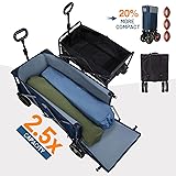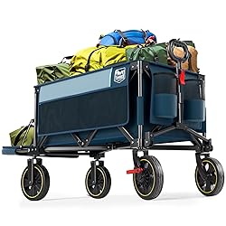 LONGER & SPACIOUS: Our collapsible folding wagon measures 49 "L x 18.9 "W x 21.5 "H. With a maximum storage capacity of 250L/8.83 cu.ft, there is 50% more storage space than in other carts of the same size. It can not only easily accommodate longer items such as 10X10 pop-up tents, but is also dog and pet friendly, making it easy for them to enter and exit BEARING BRAKES: Equipped with a state-of-the-art 360° rotating front wheel and precision-bearing brakes, this wagon outperforms standard foot brakes in both stopping power and control. Effortlessly navigate trails and park securely on inclines – the ultimate choice for savvy Amazon campers who prioritize safety without sacrificing convenience HEAVY DUTY STEEL: The Sports wagon features a stable design with 2 cross chassis and 25×12mm thickened high-strength metal frame, which is more stable and safer than other wagon carts, and can easily hold up to 300 pounds SMALLER FOLDED SIZE: Our folding wagon features a patented fully collapsible construction that sets up in seconds with no assembly required. Despite its larger capacity, it is almost half the size of other wagons. Overall dimensions when folded are 12"L x 7" W x 30" H. Product Weight: 25.4 lbs. It can be conveniently stored in your home, garage and car trunk with minimal space required BELIEVE US: At TIMBER RIDGE, each product is meticulously crafted with care and supported by our dedication to ensuring customer contentment. Should any concerns arise, our assistance is readily available