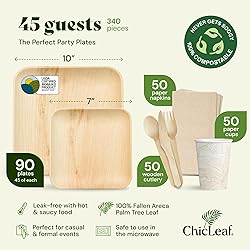 - Chic Leaf presents its Compostable & Biodegradable Palm Leaf Disposable Party Plates, Cups & Napkins Set, an eco-friendly and sophisticated choice for those who prioritize environmental responsibility and style. Crafted from naturally fallen palm leaves, these sturdy and elegant plates are a perfect alternative to traditional paper or plastic options, making them suitable for a wide array of events. Ideal for eco-conscious individuals and design enthusiasts, these bamboo-like wooden plates are capable of accommodating a variety of dishes, from appetizers to main courses. Their robust construction ensures they are suitable for both hot and cold foods, making them versatile for all dining experiences. The lightweight nature of these plates makes them perfect for outdoor events, picnics, and stylish indoor celebrations, allowing for effortless transport and setup. Chic Leaf's palm leaf plates are more than just party supplies; they are a statement of eco-friendliness and elegance. They are designed for those who wish to make green choices without compromising on style or functionality. Whether used for Halloween parties or everyday dining, these decorative paper plates offer both beauty and practicality. Embrace the spirit of the season and elevate your dining experiences with Chic Leaf's exceptional tableware, creating memorable moments while contributing to a greener future.