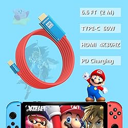 【Upgrade Switch Docking Station】Portable design that combines HDMI/USB C and charging ports into one, completely replacing the Switch dock and HDMI cable. The full-length 2M/6.6F USB C to HDMI adapter charger cable makes your travel more convenient. Built-in upgraded high-performance chip, not only for Nintendo Switch, but also supports Switch OLED. Multi-functional Switch adapter meets all your needs when working or playing games. Perfect for video game, movie, computer, office 【4K Video Output】Switch HDMI cable supports 4K high resolution and 30Hz high refresh rate to maximize your gaming experience.(Nintendo Switch only supports 1080P)Switch TV dock can project movies from your phone to your TV for a better viewing experience. Or use a projector to show files from your computer during a meeting. Either way, larger videos will make you feel more excited and comfortable!(iPhone 15 can be projected directly onto a TV device without any further action) 【Play While Charging】This USB C Charger Cable supports 100W PD fast charging, so you can play games and charge at the same time without damaging your Switch console. Avoid the hassle of running out of battery while playing games. HDMI to USB cable allows for more centralized functionality and keeps the desk tidy.(Note: Charger power greater than 39W or voltages of 7.5V and 15V are required to enable TV mode. The Switch original charger is recommended) 【Stylish & Durable】Switch portable dock features Nintendo's classic red and blue color scheme. The main part of the cable is made of PVC, and the aluminum alloy shell allows for faster heat dissipation and more efficient operation. The plug ports are gold-plated for added durability and stylish. Stylish appearance plus powerful functions easily win more people's favor. It is the best choice as gift for husband, father, son, brother, family, friends on Christmas, Halloween, New Year, birthday. 【Widely Compatibility】Compatible with Nintendo Switch/OLED,Steam Deck,MacBook/MacBook Pro2017-2022,iPad Pro2018-2021,iPad mini6,iPadAir4/5 10.9inches, Samsung Galaxy S20/S20 Plus/S20 Ultra/S10/S10+/S10e/S9/S9 Plus/S8/S8Plus/Note 10/Note 9/Note 8, Huawei P30/P30 Pro/Mate 10/Mate 10 Pro/Mate20/Mate 20 Pro, Dell XPS 15/XPS 13, HP Envy 13, HP Specter x360, smartphones, tablets, laptops that have Type-C data transfer interfaces and so on. Not compatible with Nintendo Switch Lite.
