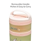 Stackable, interlocking containers for snacking on the go, featuring unicorns Includes three containers, measuring 1/3 cup, 1 cup, and 1 cup Twist 'n' Lock system connects containers for easy portability Removable handle makes stack easy to carry or clip to a bag BPA and phthalate-free; dishwasher and freezer safe; manufacturer’s limited lifetime warranty