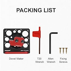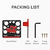 • This dowel maker features indexable carbide inserts, it makes wood dowels faster and easier.Suitable for both softwood and hardwood. The carbide inserts have 4 edges ready to be used for cutting, when a edge becomes dull, all you have to do it rotate the blade to use a fresh edge, no need sharpening.It's also replaceable,compatible with the wood turning carbide inserts, easy to get replacement. 8 diameters can be selected,loosen the screw and rotate the red knife holder to the need diameter, re-tighten the screw and then you can make dowel. NOTE:Please be sure to install firmly before use!! Specification: Model: MG0-000-0068 Material: Aluminum alloy Processing method: CNC-machined Finish: Anodized Hole diameter: 5/16, 3/8, 7/16, 1/2, 9/16, 5/8, 11/16, 3/4 (inch) Blade type: 15*15*2.5 30°R150 Carbide Inserts Product dimensions: 3.35x3.15x0.94 inch (85x80x50mm) Package Included: 1 x Dowel Maker 1 x T20 Wrench 1 x Allen Key 3 x Screw