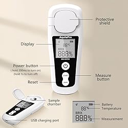 [Enhanced Precision]: Features a precise range of 0-55% with ±0.2% accuracy and 0.1% resolution, making the AquilaPro Digital Brix Refractometer a superior alternative to traditional Brix meters for sugar measurement. [Durable & Washable Design]: The sample tank is waterproof for easy cleaning under running water, though the charging port must remain dry. Ideal for beer brewing, wine making, coffee, mead making, and lab use, the device includes a 1-year warranty and lifetime technical support. (please note that alcohol reduces the solution's density, causing Brix refractometers to overestimate the sugar content in beer, making them less reliable post-fermentation) [Automated Consistency]: Comes with automatic temperature compensation (50°F to 104°F) and a high-transmission prism, ensuring accurate readings under various environmental conditions. [User-Friendly Operation]: The refractometer is easy to use—simply perform a zero calibration at initial use, add the sample, close the cover, and press the start button to get the Brix value displayed on the screen. [Efficient & Sustainable]: Boasts a high-definition display for fast readings and is equipped with a 750mAh rechargeable lithium battery, providing over a month of use on one charge, with USB charging for eco-friendly convenience.