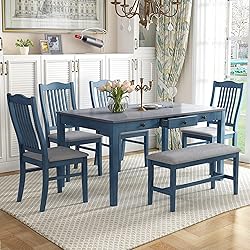 [Dining Table Set for 6] This dining table set is suitable for small apartments and houses. The dining table set equipped with 4 chairs and a long bench, which can accommodate at least 6 people, not only to meet the needs of family dining, but also to meet the needs of friends. All chairs and benches can be placed under the table top to save space. [Vintage Dining Table with Drawers] Two-tone finishes, walnut counter tops and buttermilk frames give this table the cherished elegance of a vintage castle. There is a real drawer in the middle that can be pulled open to store tableware and napkins. Please note that the other two drawers are fake. [Durable&Soft Kitchen Table Set] The tableware has both durability and softness. Rubber wood legs will remain stable while breathable pads on all chairs and benches provide a soft and comfortable feel. [Overall Product Dimensions] Table: 59x35.4x30.3inch(LXWXH); Drawer Inner Size: 15.2x13.8x2inch(LXWXH); Dining chair: 22x17x38.6inch(LXWXH), Seat depth:17inch; Seat to ground:18.7inch; Dining bench: 36.2x13.8x18.7inch(LXWXH) [Assembly and Customer Service] Complete assembly is required. This dining table set comes with detailed instructions that can be followed step by step to help you complete the assembly as quickly as possible. Any damage during transit or any defects after receipt will be covered. If you have any questions, please feel free to contact our customer service.