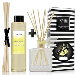 - LOVSPA Meyer Lemon Reed Diffuser Refill, 4 oz, Bundle with Meyer Lemon Reed Diffuser Set – LOVSPA Meyer Lemon Luxury Reed Diffuser gives any space a luxurious ambiance with delectable scents that freshen up your home. The fragrance is a clean, refreshing citrus scent with sliced lemons and a hint of soft sugary nuances. Makes a fantastic kitchen or bathroom air freshener! Featuring a sleek, stylish glass bottle that boasts an individual design with a classic shape & a modern stripe etching to complement any decor interior. Gorgeous packaging is the perfect complement to our beautiful bottles filled with real spices, fruit and botanicals. Concentrated and highly effective, our diffusers do not contain alcohol. Each set comes with concentrated fragrance & a set of diffuser reeds. Reed diffusers will emit long-lasting fragrance; much longer than a candle and, with no flames, they are more practical. Paraben, sulfate, phthalate and phosphate free. Vegan. Never tested on animals. LOVSPA Fragrances Reed Diffusers are beautifully gift boxed, making them a perfect gift idea for any occasion; Great for a Birthday or Christmas. The elegant LOVSPA Fragrances Collection of Reed Diffusers will transform your home into a fragrant spa retreat. Using the science of aromatherapy, our scents are expertly blended to soothe, uplift or restore. Stunningly styled, pleasing to the eye and with fabulous fragrances to choose from, there is no doubt that our creations make a positive addition to any home. We at LOVSPA Fragrances understand that home fragrance is a very personal choice with an enormous power to enhance the home and we thank you for your support of our small business. Be sure to check out our Storefront for more revolutionary home fragrance and spa products! LOVSPA Fragrances Give any space a luxurious ambiance and love the air you breathe.
