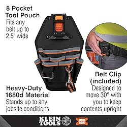 - Klein Tools' 8 Pocket Tool Pouch keeps tools where they are needed, when they are needed. This pouch is great for carrying a variety of tools for everyday jobs. Attaches to any belt up to 2.5-Inch wide and seamlessly connects to Klein's MODbox Mobile Workstation for easy storage and accessibility. For more than 160 years, Klein Tools has manufactured premium-quality, professional-grade hand tools that deliver the performance, durability and precision needed to get the job done right. Our family of engineers, workers and craftsman continue to put six generations of expertise into every tool we create by using only the highest quality materials, superior workmanship, and keeping manufacturing as close to home as we can. Klein isn't just the name of our company, it's also our family name. And since we're an American company that's family-owned and family-run, you know you can count on us to be here tomorrow. Klein Tools doesn't just make great products, we make great products that stand up to the demands of the professionals who use them every day ... Since 1857.