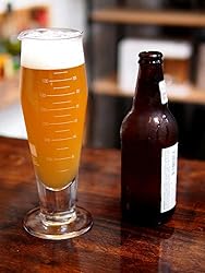 The visual and functional cues of a laboratory beaker are applied to a modern Pilsner glass Laboratory beaker style curled lip, pulled spout, metric scale Perfect for pilsners, lagers, wheats, and IPAs Dishwasher Safe