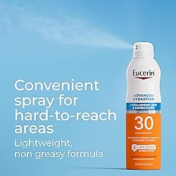 - Eucerin Sun Advanced Hydration SPF 30 Sunscreen Spray is a fragrance free sunscreen enriched with Hyaluronic Acid and Humectants to attract and replenish skin’s natural moisture, leaving skin hydrated and supple for up to 8 hours. This body sunscreen spray features UVA/UVB sun protection plus an Advanced Antioxidant Complex, 5 AOX Shield, that goes beyond neutralizing to also guard from free radicals and help support skin health. This lightweight sunscreen spray dries clear, leaving no visible residue. It is also a water resistant sunscreen (up to 80 minutes). Eucerin Sun Advanced Hydration Sunscreen Spray SPF 30 comes in a convenient spray bottle for hard-to-reach areas. Developed with dermatologists, this spray on sunscreen is suitable for sensitive skin and is free of fragrance, alcohol, dyes, parabens, PABA, phthalates, oxybenzone and octinoxate. Eucerin is a dermatologist-recommended skincare brand that is based on an uncompromising approach to science. (1)with continuous use. Use as directed with other Sun Protection Measures (See Drug Facts Box)